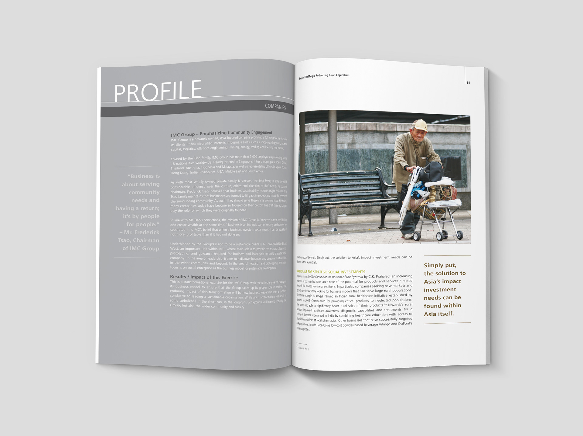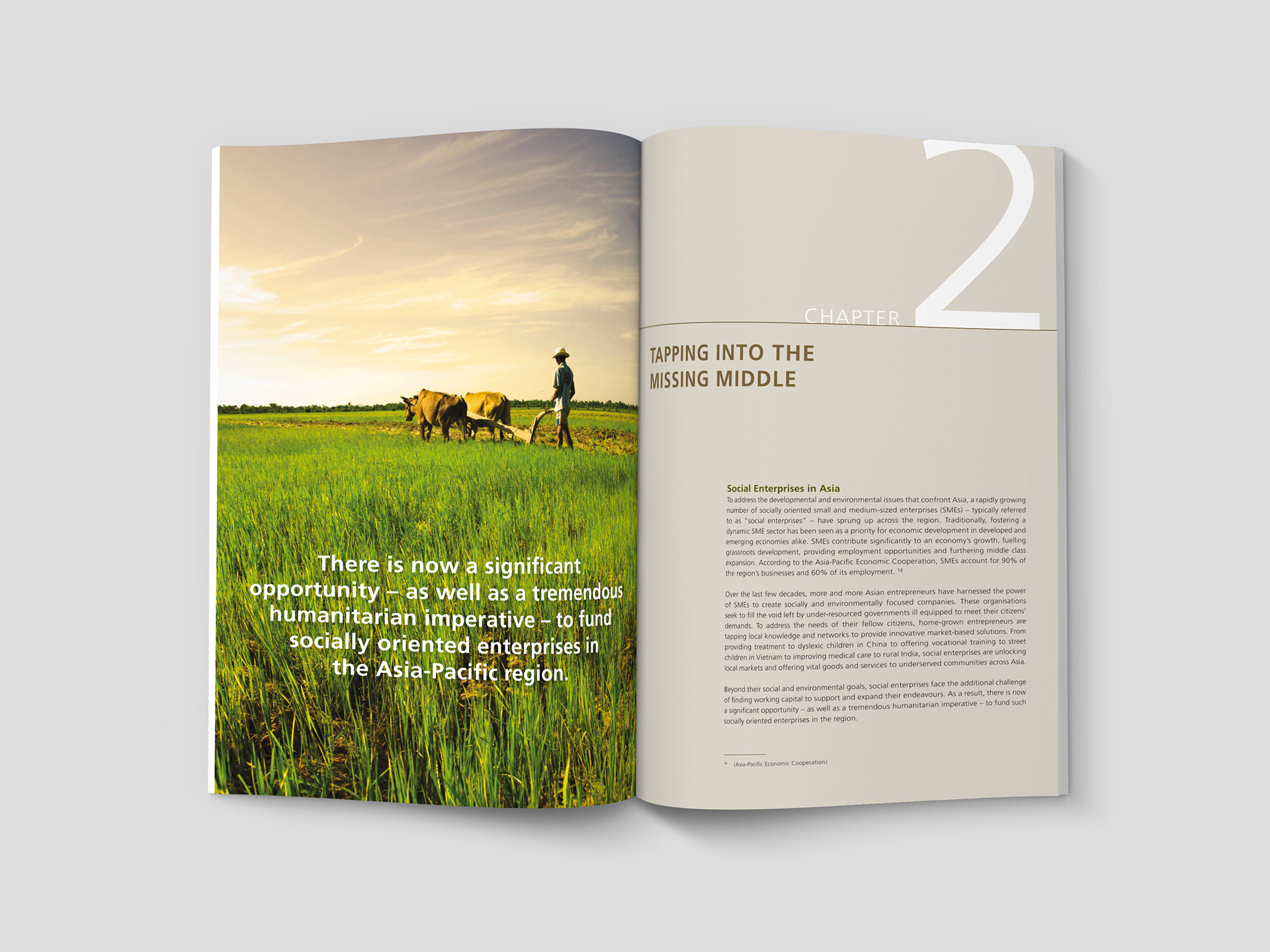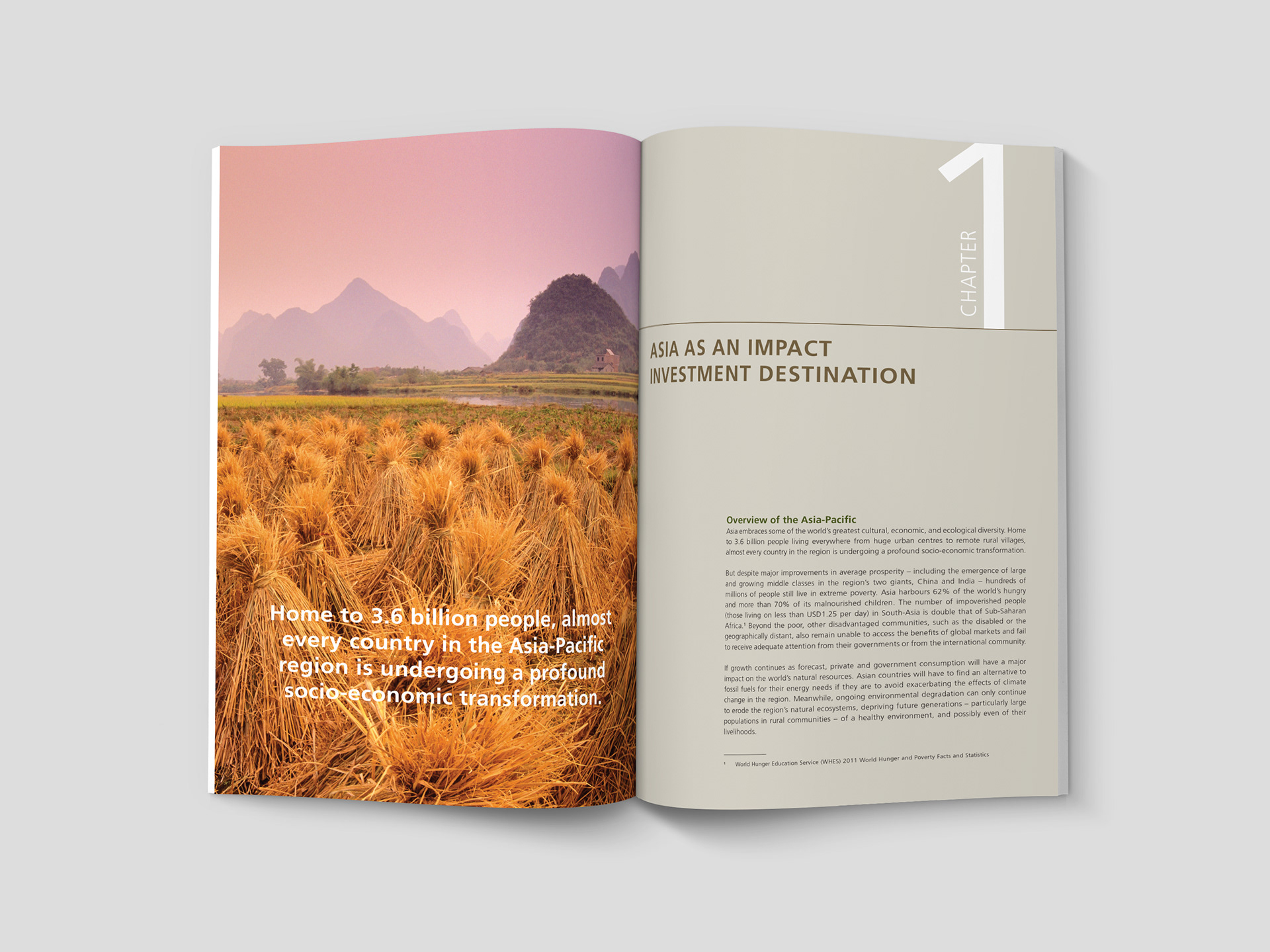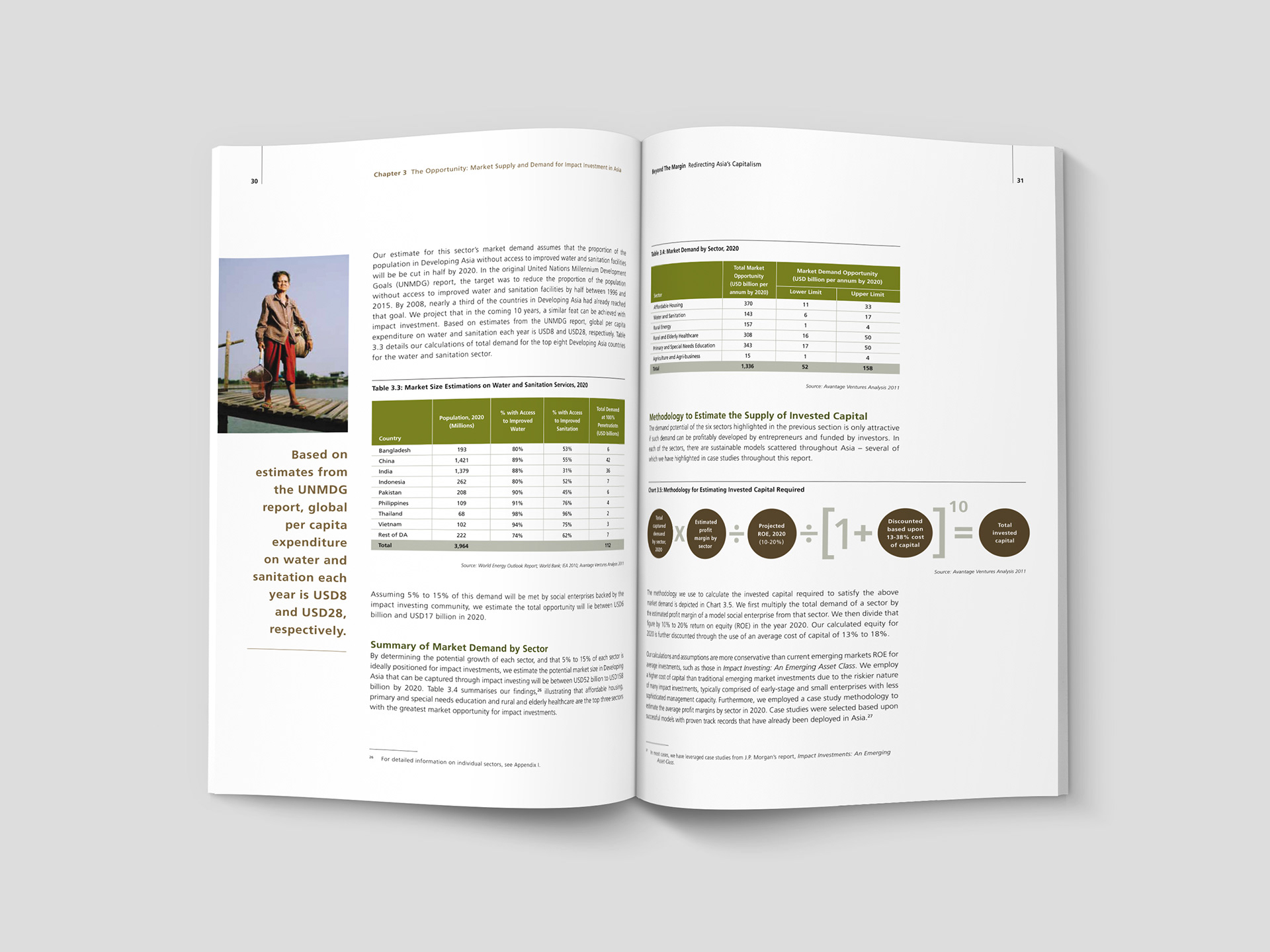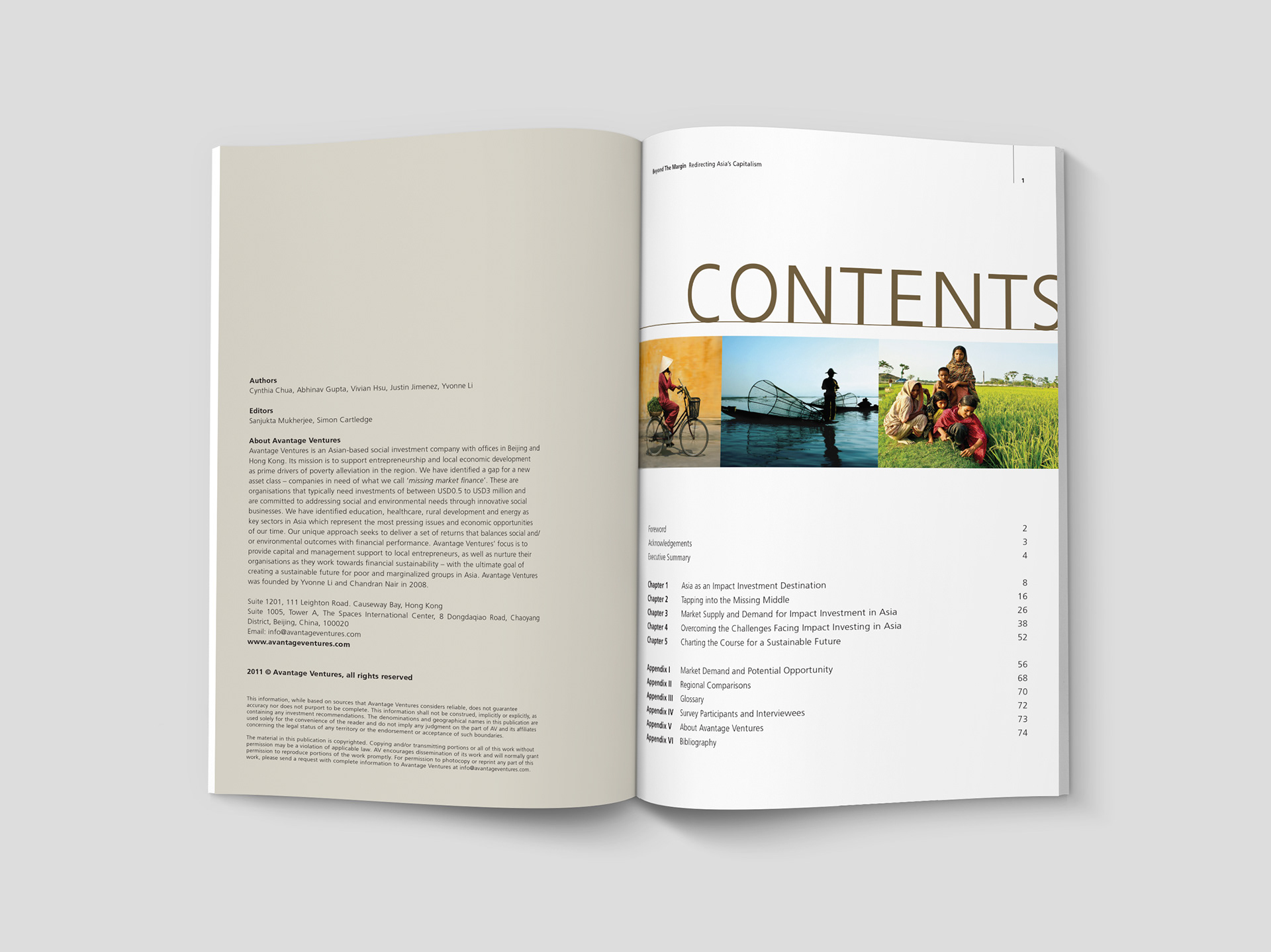 Research report design for Avantage Ventures on the topic of social and impact investing. Powerful imageries, strong typography and info-graph, as well as a considered layout are used to present and communicate the text heavy information. It is also designed with earth tone palette and printed on uncoated paper for a down to earth look and feel.
