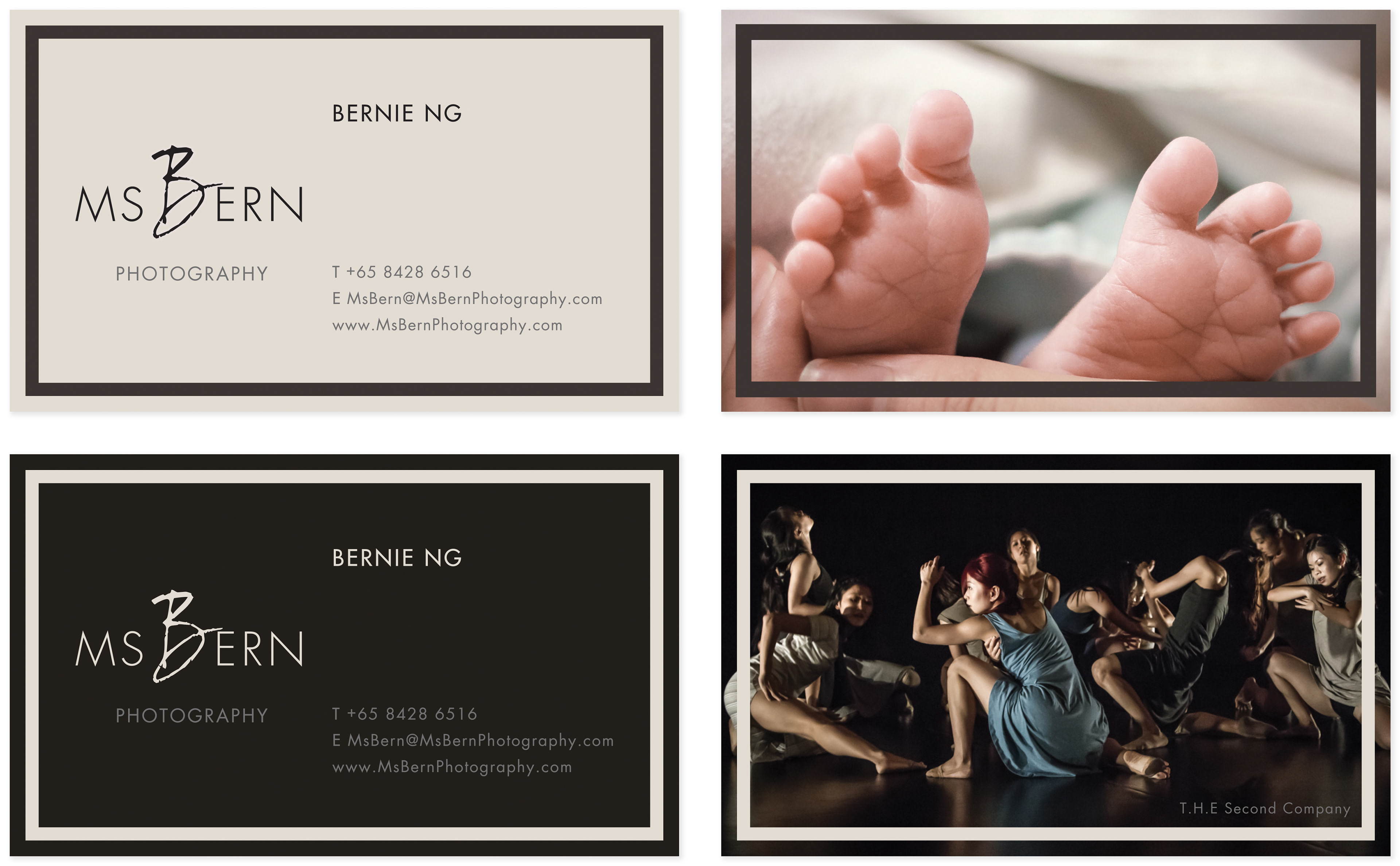 Logo and stationery design for MsBern Photography. Two sets of stationeries are designed to reflect the two aspects of the business – family portraits and dance photography – while at the same time to compliment each other and work as a set.