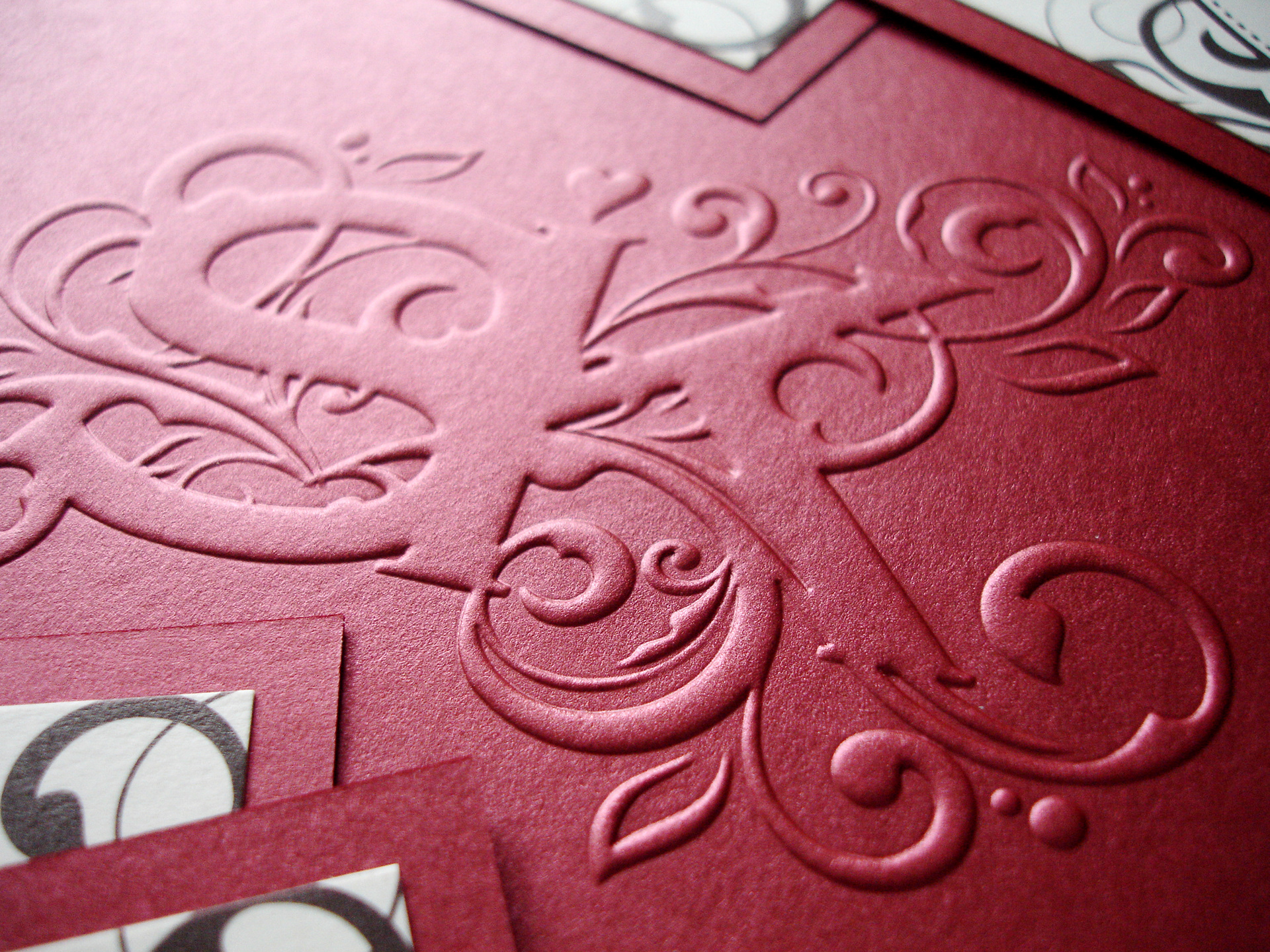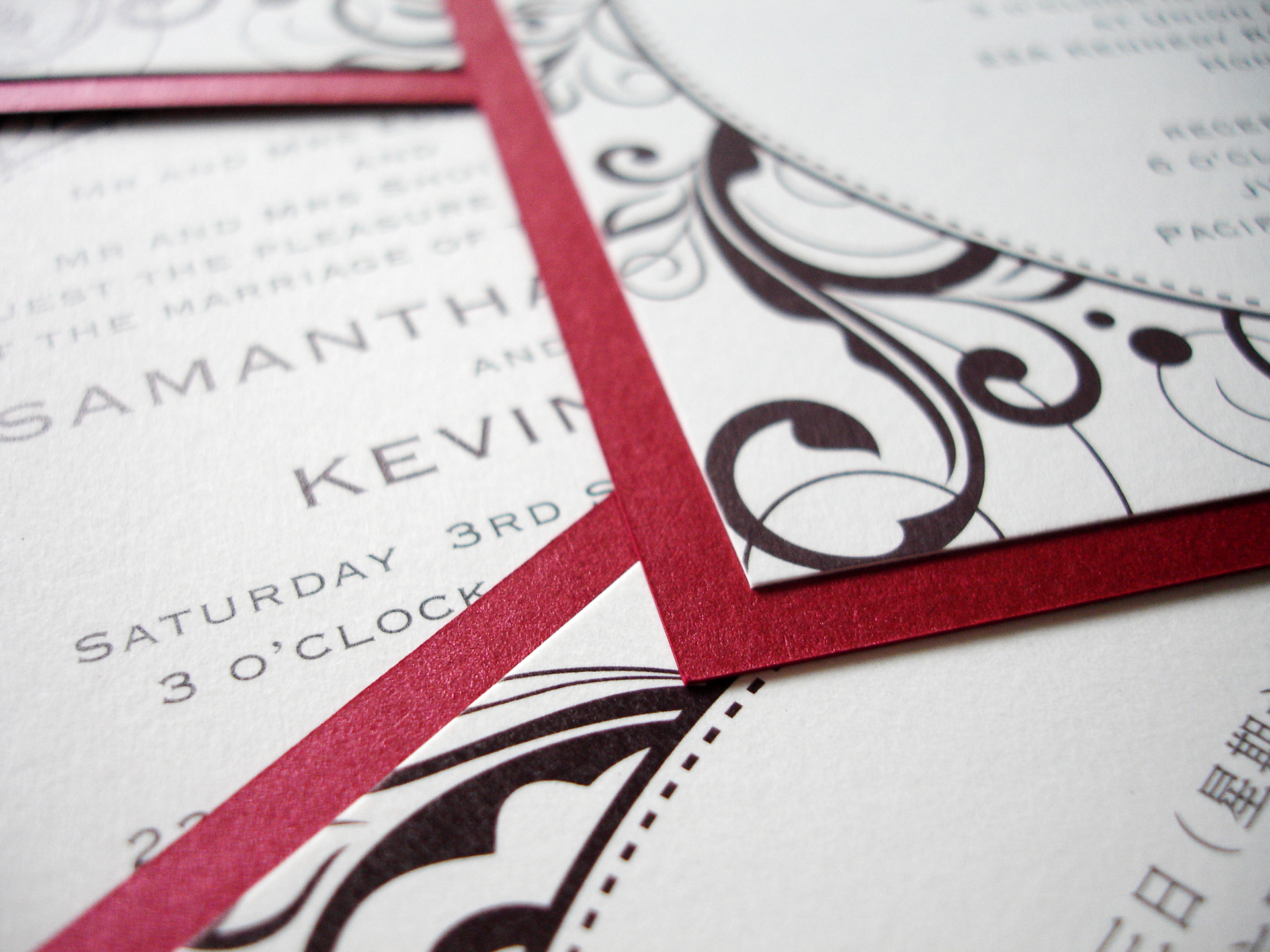 Wedding invitation design for Samantha & Kevin. A monogram was especially created with the couple's initials. Matching ornamented pattern continues throughout the design.